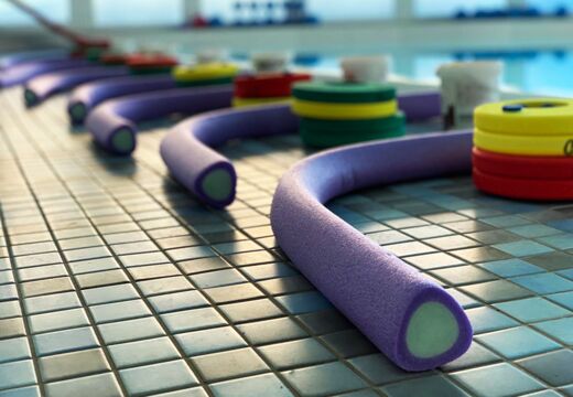 Die weitreichend verglaste Fensterfront sorgt mit Wellenoptik abgesetzt für eine freundliche – von der Lufttemperatur her fast schon karibische – Atmosphäre bei angenehmen Wassertemperaturen zwischen 30 und 32°C. Ein buntes Equipment sorgt dafür, dass das Training im Wasser vielseitig bleibt und Spaß bereitet.