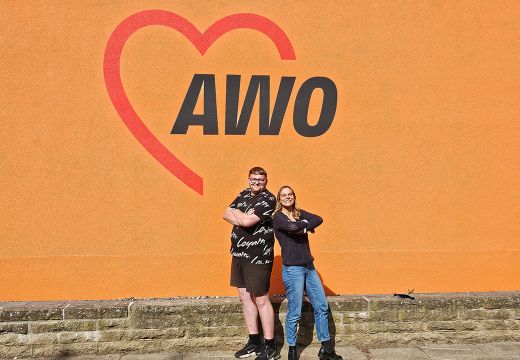 Drei Personen in roten Oberteilen vor dem Eingang des AWO Treffpunkts „Deja Vu“ in einem orangefarbenen Gebäude mit Rampe und Treppe.