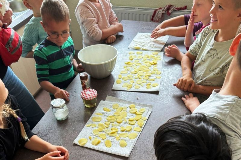 Im März haben die Kinder der AWO Kita Abenteuerland in ihrem Projekt Nachhaltigkeit zwei Kartoffeln zum Keimen in ein Aquarium gesteckt. Die Kinder aus der Gruppe Fuchsbau konnten so beobachten, was unter der Erde passiert. Letzte Woche wurde geerntet und die Kinder waren erstaunt, wie viele Kartoffeln sie ausbuddeln konnten. Anschließend haben wir die Ernte gemeinsam verarbeitet: In unserer Kinderküche entstanden knusprige Pommes und Chips. Dazu gab es leckeren Kräuterquark, den die Kinder selbst aus frischen Zutaten angerührt haben. So konnten die Kinder den gesamten Kreislauf vom Pflanzen über das Wachsen und Ernten bis hin zur Zubereitung und zum Genießen erleben – ein wertvoller Einblick in Nachhaltigkeit und gesunde Ernährung.