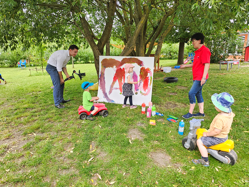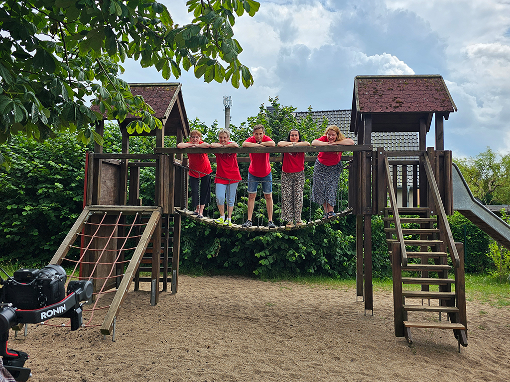 Nachdem wir uns durch unzählige Szenen und Fotomotive gekämpft hatten, ging es mit vollem Elan weiter in unsere Kita „Die kleinen Schulzen“. Dort erwartete uns ein weiteres Abenteuer: Kinder, die sich mindestens genauso sehr auf die Kamera freuten wie wir. Schnell war klar, dass wir einige zukünftige Schauspieler in unseren Reihen haben. Die kleinen Stars haben uns gezeigt, dass sie genauso gut improvisieren können wie die Großen. Und auch die Großen haben alles gegeben und beim Albern sein richtig viel Spaß gehabt.