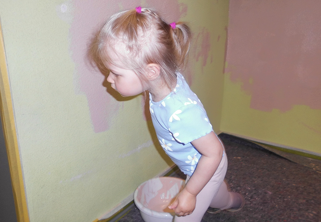 Ein kleines Mädchen malt mit einem Pinsel an einer Wand