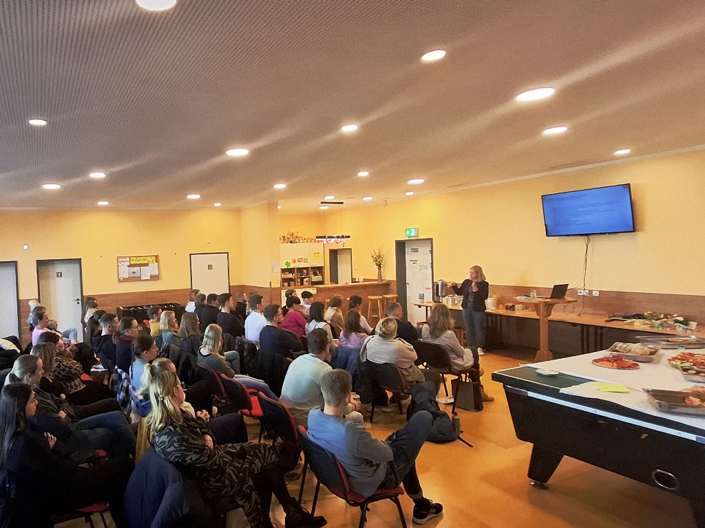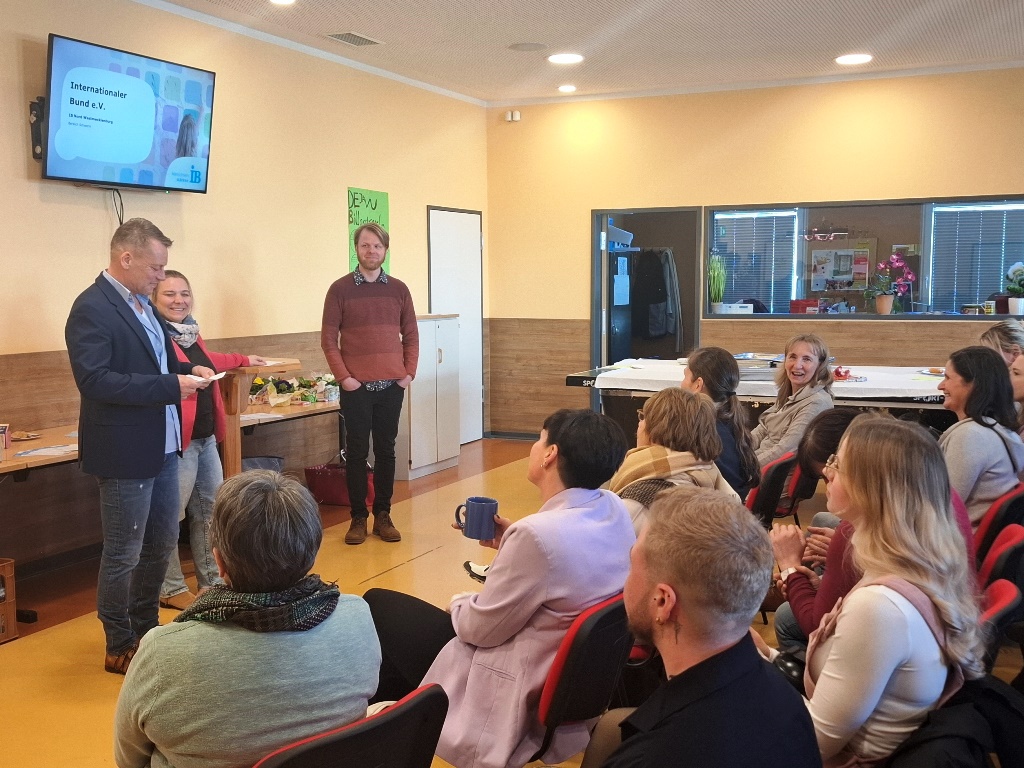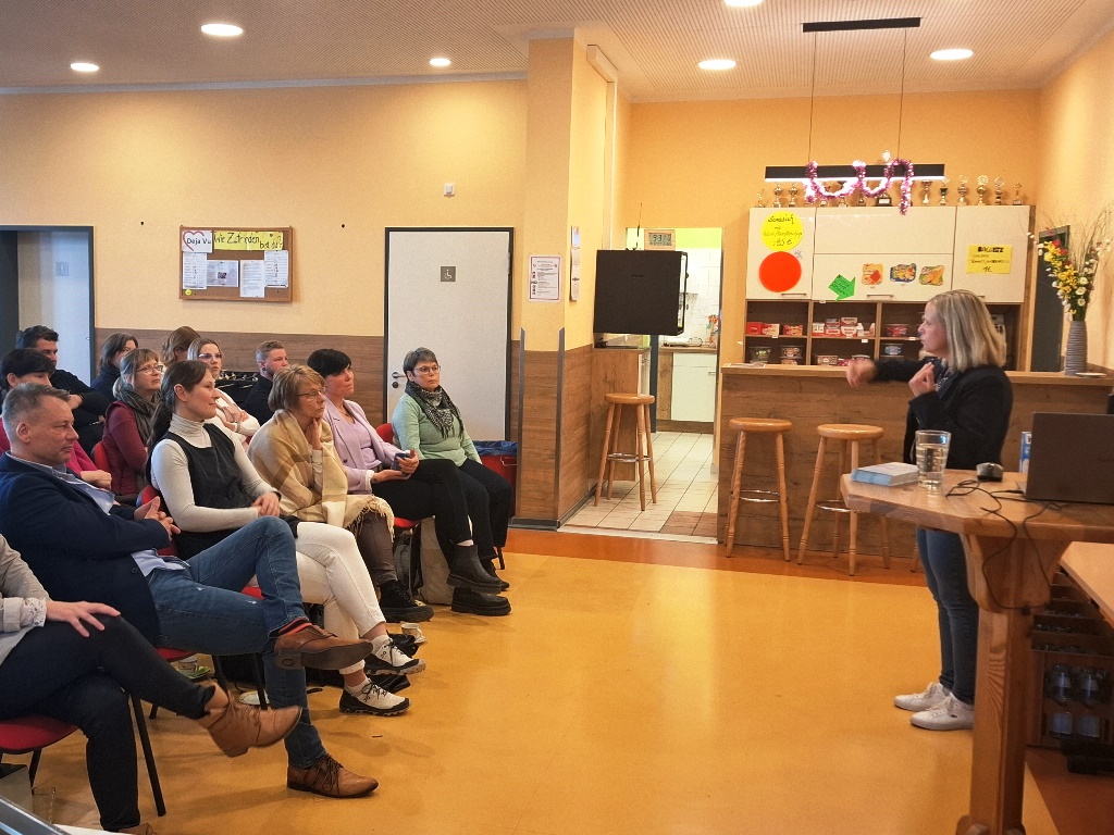 Am 19. März – beim ersten Treffen aller Mitarbeiter*innen starteten wir mit einem gemeinsamen Frühstück, geplant und vorbereitet vom Catering-Team des KJND. Eine unserer Gäste und Netzwerkpartner an diesem Tag war die Koordinatorin des Childhood-Hauses in Schwerin Nadine Schirrmacher. Sie berichtete vom Haus als eine kinderfreundliche, interdisziplinäre, ambulante Anlaufstelle für Kinder und Jugendliche, die körperliche und sexualisierte Gewalt (mit)erlebt haben. Nadine gab uns mit ihrem leidenschaftlichen Vortrag einen Einblick in das Aufgabenspektrum und zog Resümee nach dem dreijährigen Bestehen des Hauses. Weiterhin begrüßten wir Jana Beyer und Richard Leopold vom IB. Unkonventionell und engagiert stellten sie ihr Arbeitsfeld mit den täglichen Herausforderungen in der Tagesgruppe und Integrationshilfe vor. Sie berichteten von der engen Zusammenarbeit mit den Kindern, um soziale Kompetenzen zu stärken und emotionale Stabilität zu fördern. Und von der Integrationshilfe, wo sie als Fachkräfte Kinder mit Behinderungen oder besonderen Bedürfnissen dabei unterstützen, sich in regulären Lehr- und Betreuungsumgebungen zu integrieren.