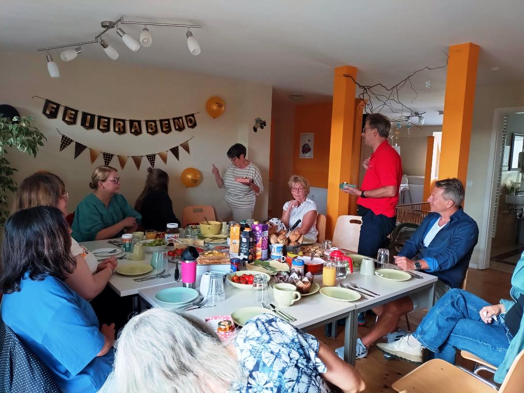 „Nach 14 Jahren haben wir als Team der Gemeinsamen Wohnform für Alleinerziehende heute unsere Kollegin Petra Heiert in den wohlverdienten Ruhestand verabschiedet. Bei einem reichhaltigen und gemütlichen Frühstück haben wir  – gemeinsam mit der Bereichsleitung – nochmal auf die vergangenen Arbeitsjahre zurückgeblickt und uns viele spannende und lustige Geschichten aus dem Arbeitsalltag in Erinnerung gerufen. Auch für die Teammitglieder gab es eine kleine liebevoll gestaltete Überraschung als Dank für die vielen schönen Jahre, die uns als Team – trotz vieler Herausforderungen – immer mehr zusammengeschweißt haben. Wir danken unserer lieben Kollegin für die sehr gute und vertrauensvolle Zusammenarbeit und wünschen ihr für die vor ihre liegende Zeit, dass all die geplanten Erlebnisse umgesetzt werden können.“