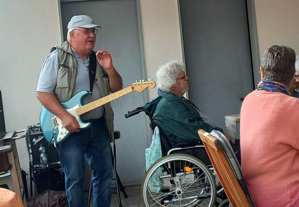 Eine Gruppe älterer Menschen bei einem sommerlichen Treffen im Freien, ein Mann spielt Gitarre.