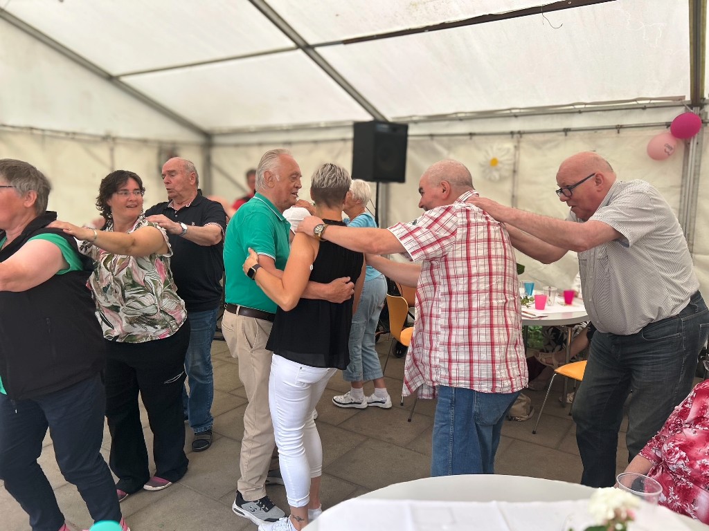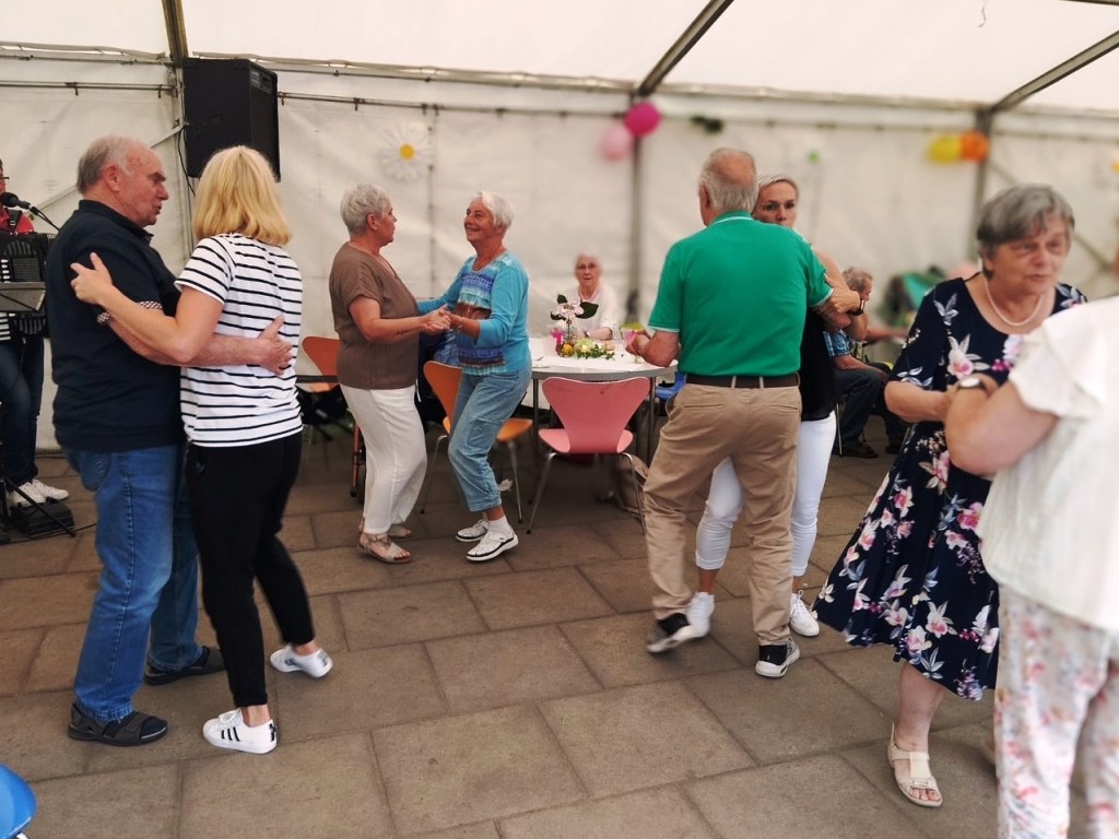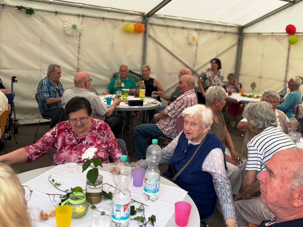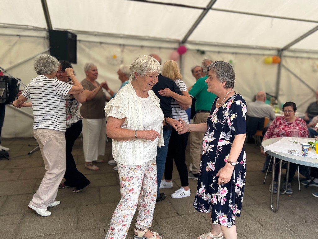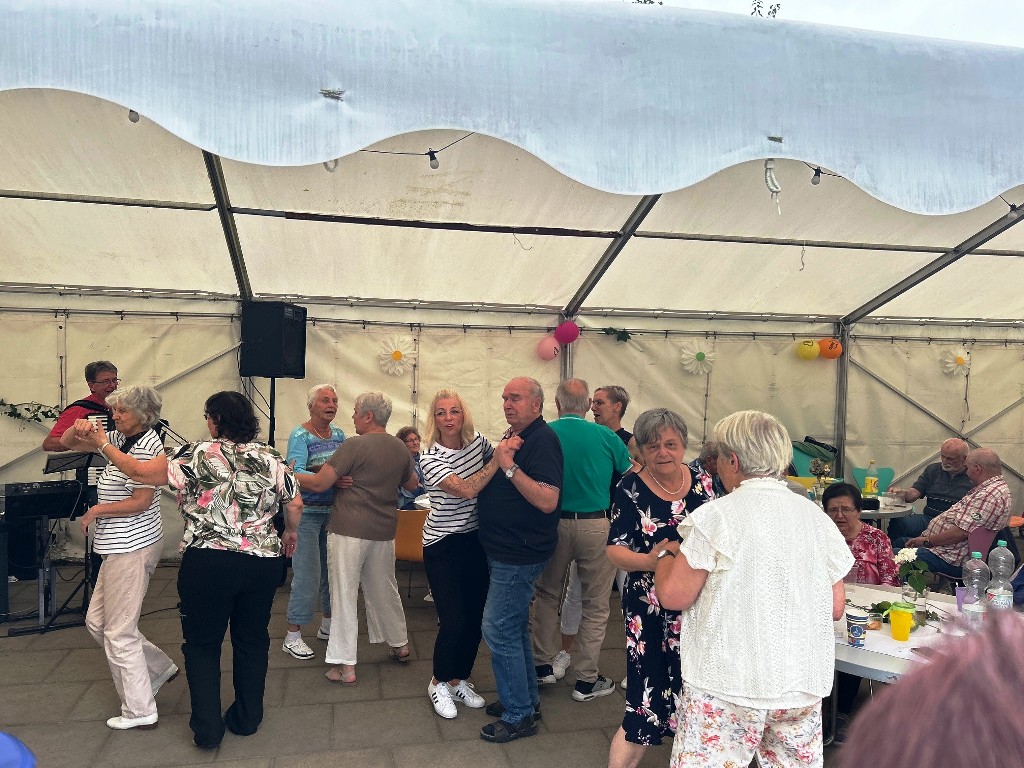 Was für ein wunderschöner Tag! Bei bester Stimmung wurde getanzt, geschunkelt, gelacht und natürlich lecker gegessen. Für jede Menge Bewegung und Spaß sorgten auch fröhliche Spiele mit dem Schwungtuch, bei denen alle mit Begeisterung dabei waren. Ein weiteres Highlight: die Polonaise durchs Festzelt, die niemanden auf dem Platz hielt! Ein herzliches Dankeschön an Peter Hahn, der mit Musik, Witz und Geschichten aus dem Leben für großartige Unterhaltung sorgte und unsere Tagesgäste zum Strahlen brachte.