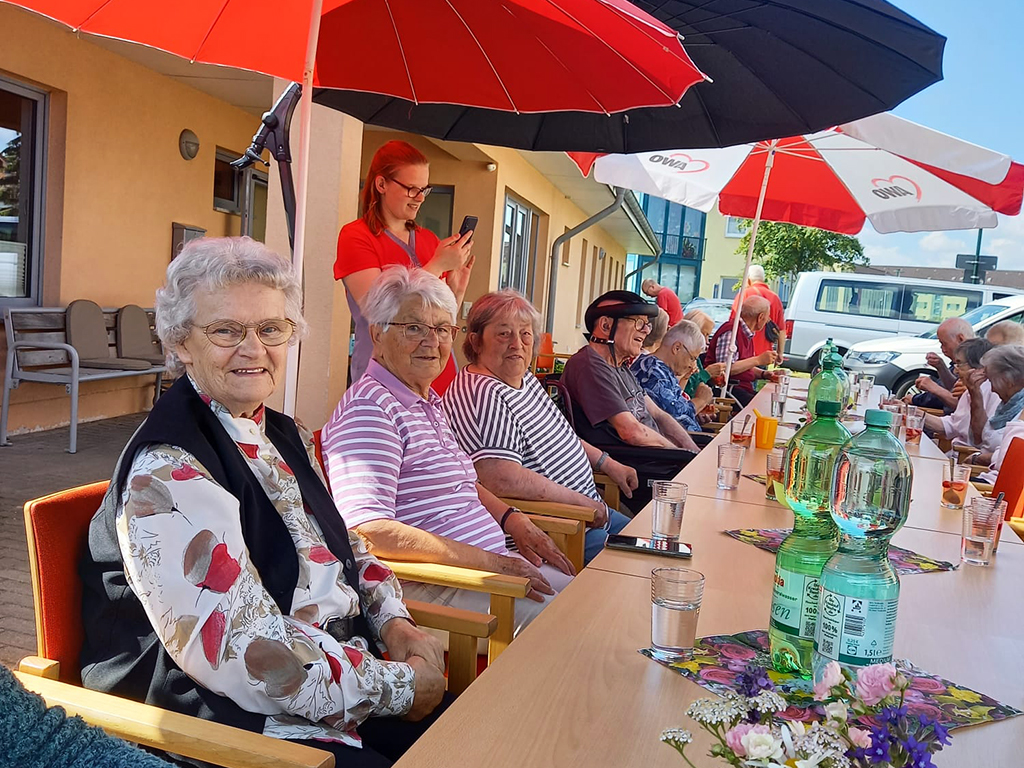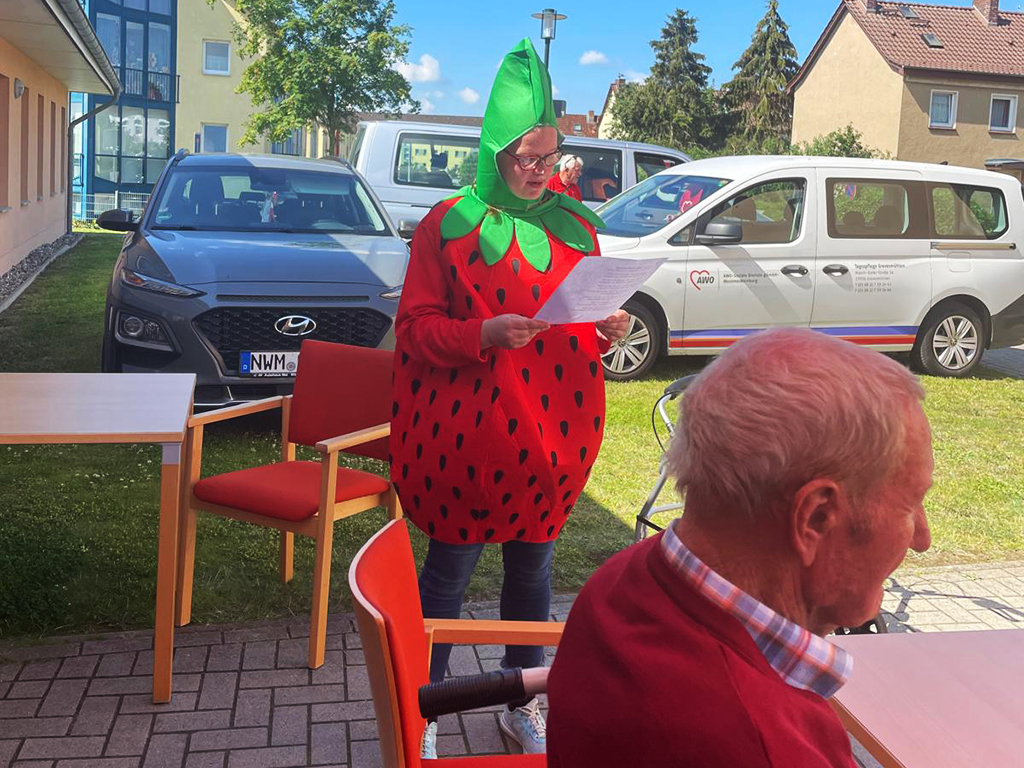 Strahlender Sonnenschein begleitete das diesjährige Sommerfest unserer Tagespflege in Grevesmühlen. Unter Sonnenschirmen genossen die Gäste Erdbeerbowle und lauschten einem passenden Gedicht über die süßen Früchte. Ein kleiner Überraschungsauftritt sorgte für Aufregung, als die Tagesgäste erraten mussten, wer sich hinter den Verkleidungen verbarg – schnell wurde klar, dass es sich um die Wildecker Herzbuben handelte. Es wurde geschunkelt, mitgesungen und herzhaft gelacht. Anschließend sorgte ein Sketch für viele Lacher, besonders bei den Frauen. „Das bisschen Haushalt…“. Gegen 11:30 Uhr wurden frisch gegrillte Steaks und Bratwürste serviert, begleitet von köstlichen selbstgemachten Salaten. 😋