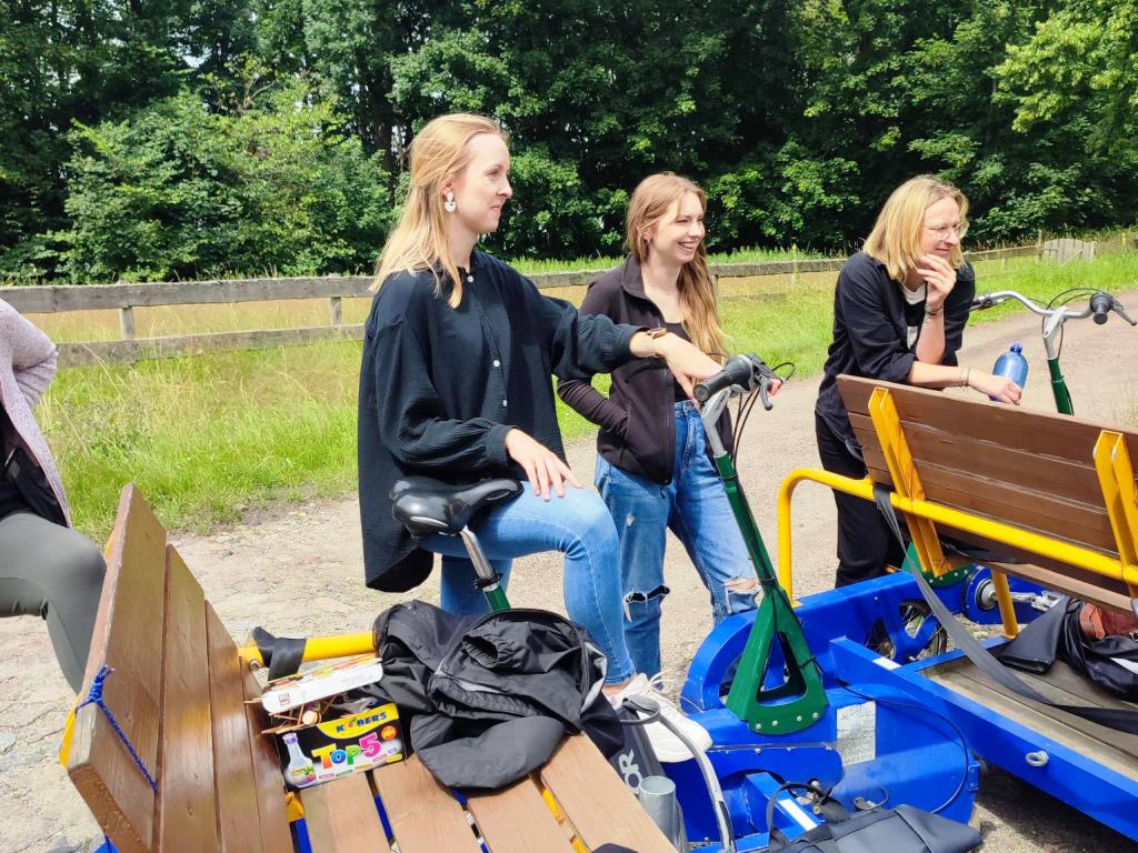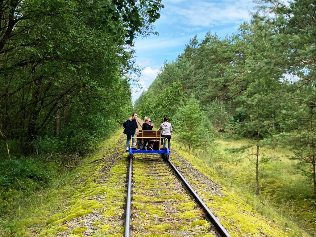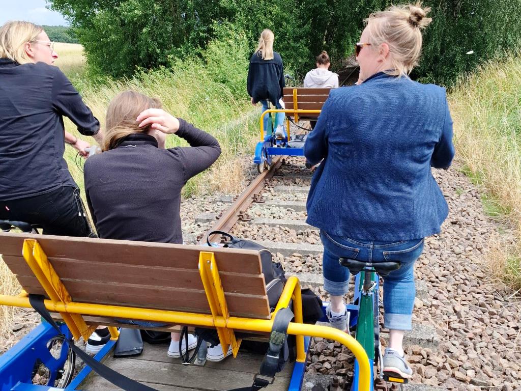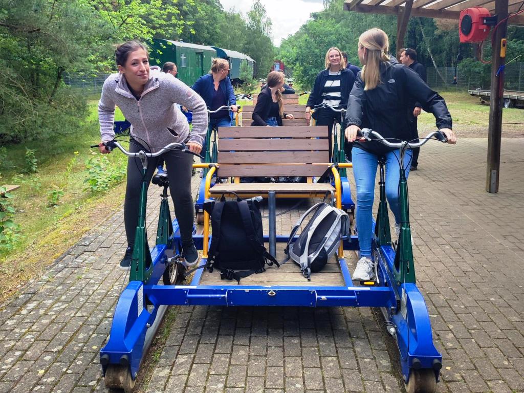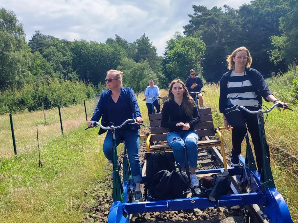 Am Vormittag ging es los in Richtung Karow. Der VW Bus war bis auf den letzten Platz besetzt, sodass sich schon auf der Fahrt lebendige Gespräche außerhalb der sonst professionellen Fachthemen und gut gelaunte Stimmung entwickelten. Am Zielort angekommen wurde das Fortbewegungsmittel gewechselt: Mit drei Draisinen ging es auf eine kurzweilige Tour durch die sehenswerte Landschaft des Naturschutzgebietes Großer und Kleiner Serrahn. Das Picknick zur Mittagspause war durch die kreativen Beiträge aus dem Team ein wahrer Festschmaus: Von Schoko-Erdbeer-Crepes über Feta-Hack-Bällchen und Mozzarella-Tomaten-Spieße bis hin zu Knoblauch- und Malzbier-Brot, Kuchen uvm. war für jeden etwas dabei. Die Vitamine kamen natürlich auch nicht zu kurz. Denn der Rückweg auf den Draisinen musste ja noch absolviert werden. Nach Abstimmung des Fahrtempos in Anbetracht der unterschiedlichen sportlichen Fähigkeiten und zur Möglichkeit der entspannten Naturbetrachtung kam das Team entspannt wieder an der Station an und konnte sich fröhlich mit neuen gemeinsamen Erlebnissen auf die Heimreise nach Schwerin machen.