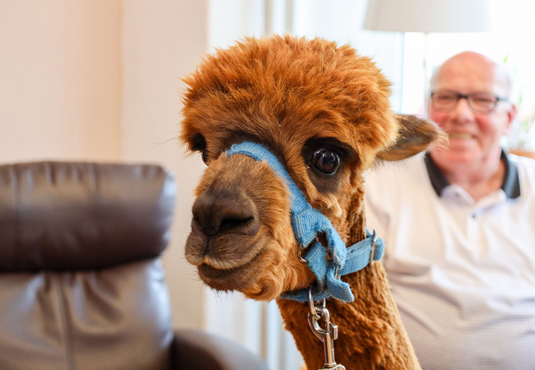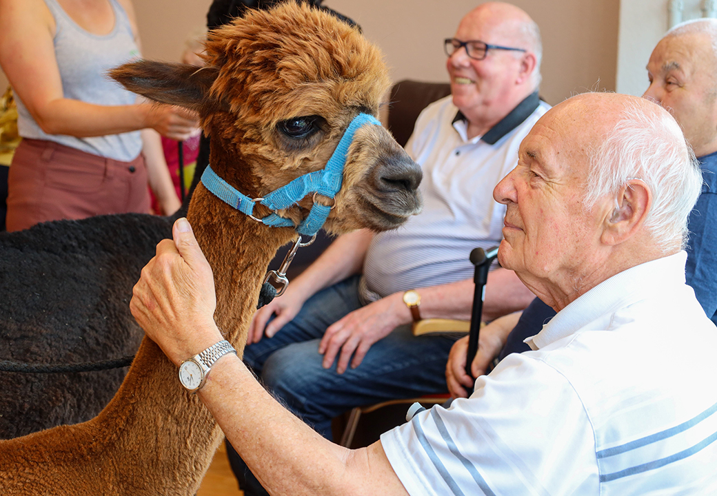 Das Ehepaar Köllner von der Alpaka-Ranch Ruhner Berge war mit Teddy und Brownie angereist und besuchte die Tagespflege Am Dreescher Markt. Dabei gaben die beiden nicht nur viele Infos über die aus Mittelamerika stammenden Tiere, auch jede Menge Streicheleinheiten wurden verteilt.