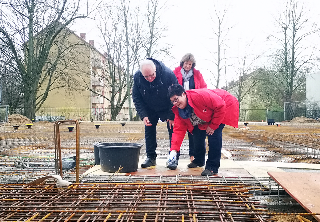 Am 31. März wurde der Grundstein für den Krippenneubau in der Kita Regenbogen gelegt. Mit dem Versenken einer Zeitkapsel im Fundament sind auch die Grüße an die Nachwelt sicher. Darin befinden sich Fotos und Informationen von der Kita, Cent-Stücke von den Kolleg*innen und Symbole der einzelnen Kindergartengruppen.